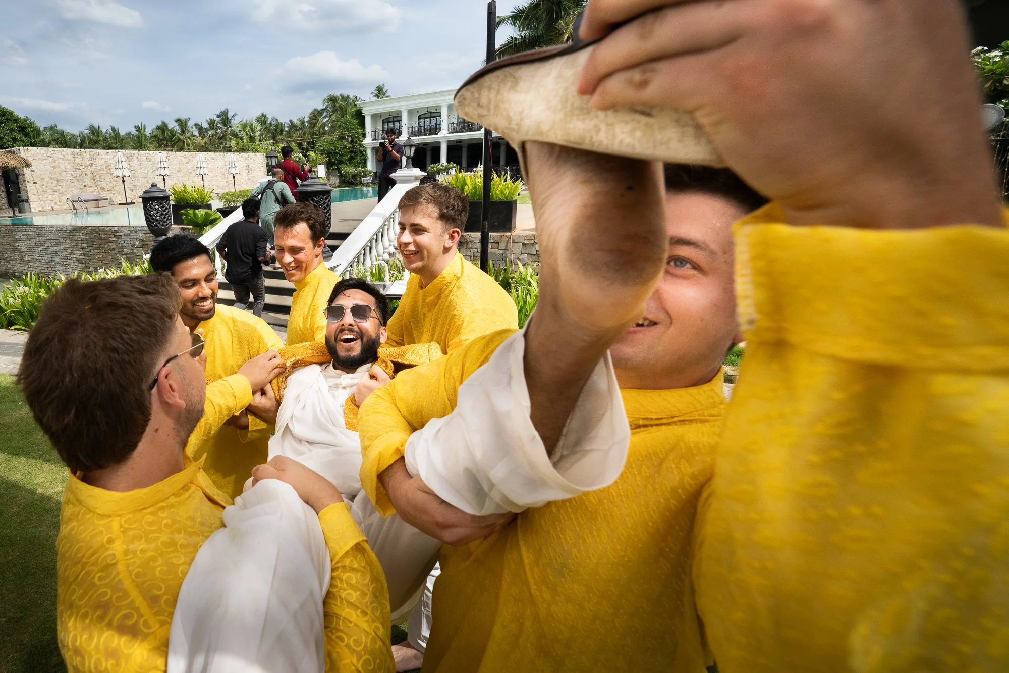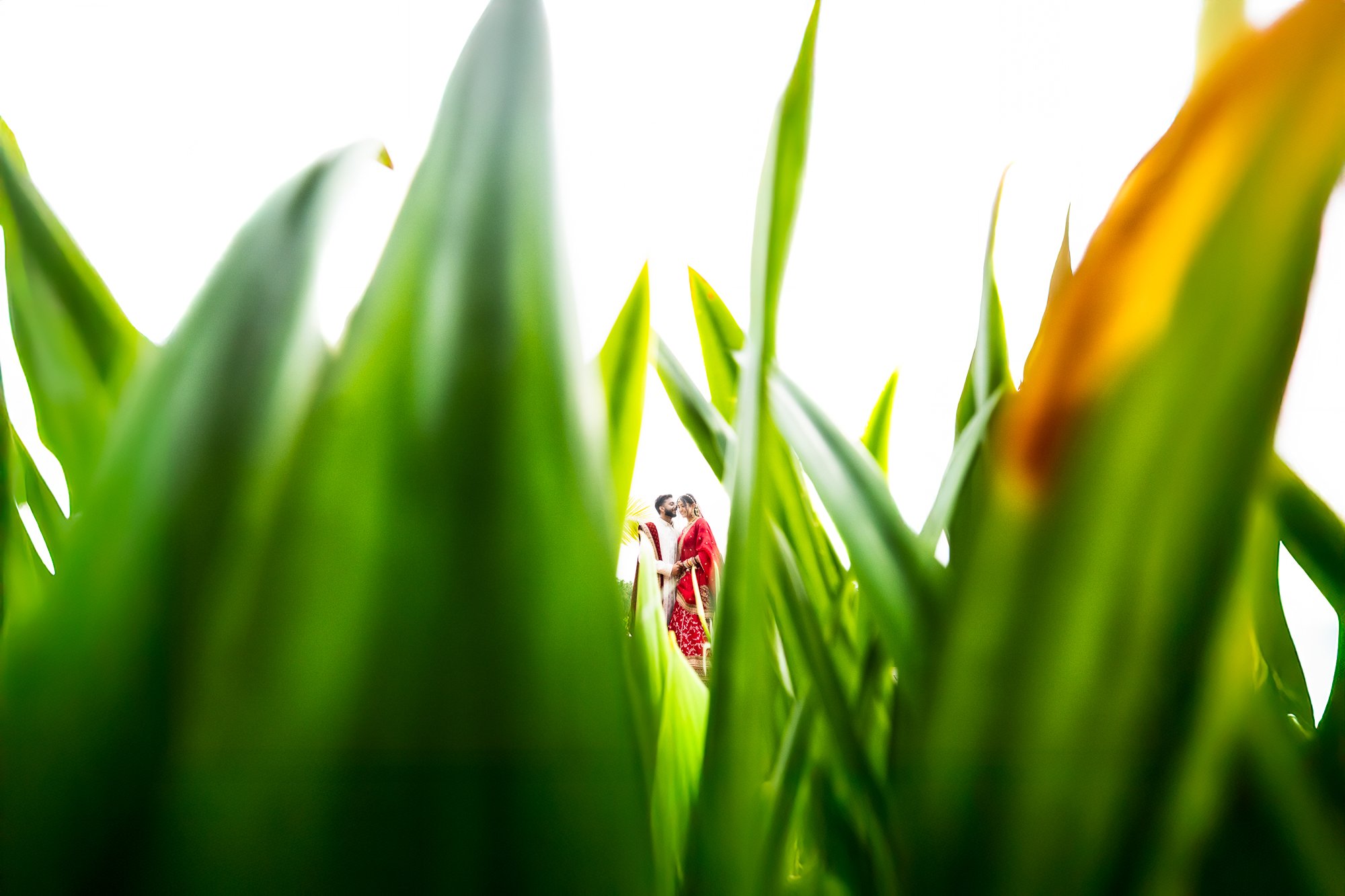 They couldn't see each other before the ceremony—ritual rules. We needed a couple portrait anyway. So we opened the door, put them on opposite sides, and hoped for magic. In two seconds, without looking, they reached out and shook hands. “All the best!” Sometimes the best portraits happen through doorways.